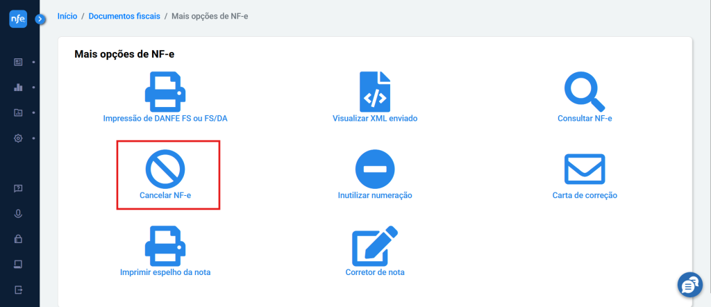 3 – Na tela Mais opções de NF-e, selecione a opção Cancelar NF-e.
