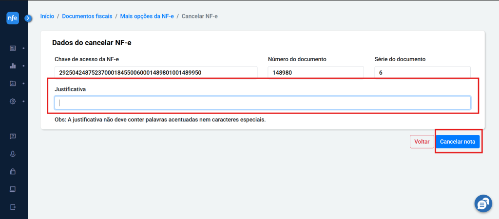 4 – Na tela Cancelar NF-e preencha o campo Justificativa e depois clique em cancelar nota: