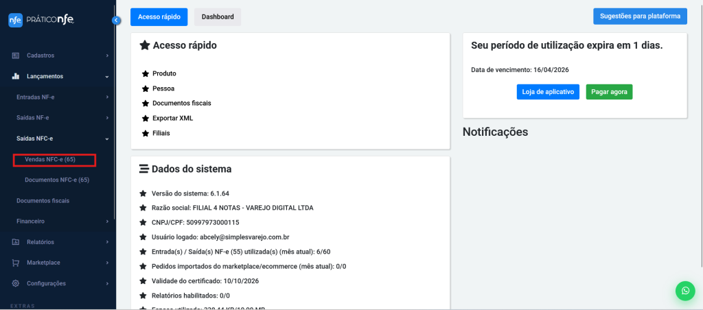 Menu >> Lançamentos >> Saídas NFC-e >> Vendas NFC-e
