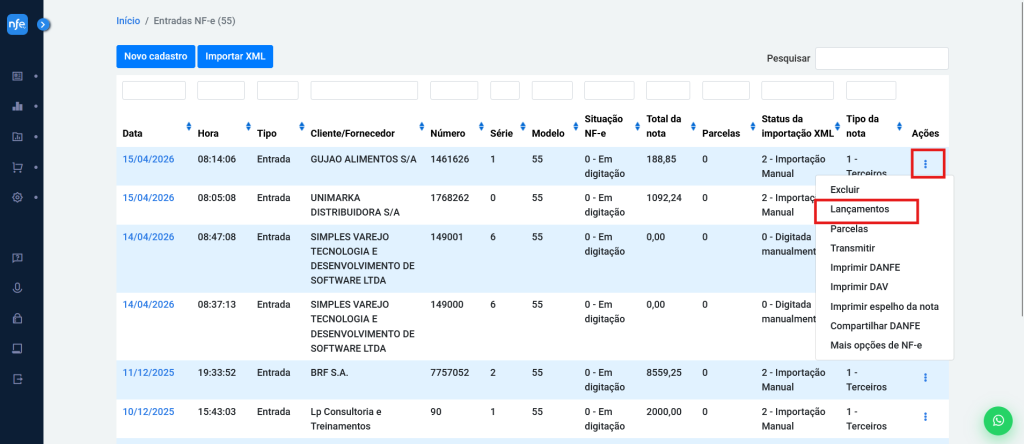 1- Acesse o menu: Menu >> Lançamentos >> Entradas >> Documentos NF-e (55)