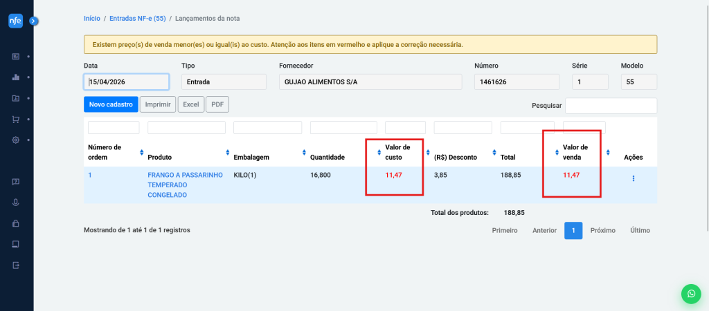 2-Será exibida a lista de produtos da nota, com: